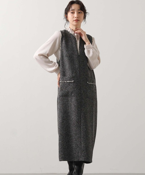 衿元とポケット口を彩る華やかなフリンジが目を惹く、ツィード調のジャンスカ。上品なキーネックデザインとストンと落ちるIラインでスッキリと着こなせるデザイン。ブラウスやニットなどとレイヤードしやすい大きめアームホールにしています。※商品画像は、光の当たり具合や使用しているパソコンのモニターやスマートフォン等の設定により、現物と画像の色味が若干異なる場合もございます。予めご了承ください。【 お買い物をもっと楽しんでいただく為に 】▼商品のお気に入り登録▼完売カラーの再入荷や、ラスト1点、セールの通知をお知らせします。割引クーポンの発行などお得な情報も!▼ブランドのお気に入り登録▼新商品や再入荷など、いち早くグレディブリリアンのお得な情報を受け取ることができます! 【Gready Brilliant】「ほどよい存在感」を大切にする大人の女性のためのセレクトショップ。