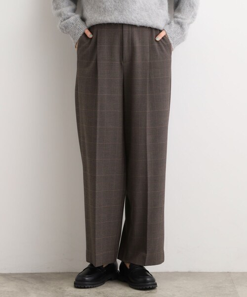 かっこよさも穿き心地の良さも叶える優秀スラックス 【デザイン】 あたたかな穿き心地が嬉しい裏起毛スラックスパンツ。 大人っぽくもスタイリッシュにも仕上がる絶妙な太さのワイドシルエット。 ジャストウエストとタックが相まって、すっきりと綺麗なラインが特徴です。 ウエストにゴールドの釦を配してアクセントに。 後ろウエストの一部にゴムを入れ、きれいめデザインながら穿き心地も◎です。 【素材】 深みのあるシャークスキン組織が大人っぽくかっこいい印象に。 柔らかな風合いの素材を使用し、穿き心地にもこだわりました。 裏起毛かつ、吸湿発熱機能性も備えており、これからのシーズンに重宝してくれること間違いなしのアイテムです。 更に、ご自宅の洗濯機でも洗えるイージーケアも魅力。 【スタイリング】 スタイリングを今っぽく引き上げてくれるアイテム。 ゆったりとしたニットに合わせてエフォートレスなスタイルも良いですし、コンパクトなニットをインしたクラシカルな装いも素敵です。 シャークスキンの組織がスタイリングに変化をつけてくれます。 【仕様】 ・ポケット数:横×2 後ろ×2 ・前ファスナー ・ウエスト後ろゴム ・裏地なし ※照明の関係により、実際よりも色味が違って見える場合があります。また、パソコン・スマートフォンなどの環境により、若干製品と画像のカラーが異なる場合もございます。 【25AW】 モデル情報:身長166cm B80 W59 H86 着用サイズ:02(M) 店舗へのお問い合わせ商品番号:768-64006 ●製品寸法: 01(S):W66cm H93cm 股下67cm 前股上30cm 渡り幅32cm 裾幅24cm 02(M):W69cm H96cm 股下68cm 前股上30cm 渡り幅33cm 裾幅25cm 03(L):W72cm H99cm 股下69cm 前股上31cm 渡り幅34cm 裾幅26cm 04(LL):W75cm H102cm 股下70cm 前股上31cm 渡り幅35cm 裾幅27cm 05(3L):W78cm H105cm 股下70cm 前股上31cm 渡り幅36cm 裾幅27cm 備考: