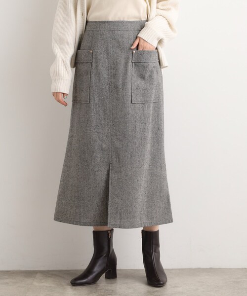 クラシックな素材にユーティリティの遊び心を【デザイン】クラシカルなツイード素材で仕立てたAラインスカート。パッチ&フラップポケットや前中心のスリットなど、ユーティリティ感を加えたディテールがアクセントになっています。後ろウエストはゴム仕様で着心地が良く、フラップにはゴールドのカシメをあしらい上品な輝きをプラスしました。【素材】奥行きのあるミックスツイード素材を使用。クラシカルな表情を持ちながら、杢糸をミックスすることで、良質感と華やかさを兼ね備えています。中肉の素材感で、冬のニットスタイルにしっくりはまる素材です。【スタイリング】シャツやタートルニットをインしてトラッドな着こなしに、ニットやスウェットを合わせてカジュアルに外すスタイルもおすすめです。ブーツやパンプスとの相性も良く、フラップやスリットのディテールがコーディネートにアクセントを与えます。【仕様】・ポケット数:横×2・ウエスト後ろゴム・裏地あり※こちらの商品はやや透け感があります。※照明の関係により、実際よりも色味が違って見える場合があります。また、パソコン・スマートフォンなどの環境により、若干製品と画像のカラーが異なる場合もございます。【25AW】モデル情報:身長166cm B80 W59 H86 着用サイズ:02(M)店舗へのお問い合わせ商品番号:768-74026●製品寸法:01(S):W65~91cm H102cm 総丈82cm02(M):W68~94cm H105cm 総丈84cm03(L):W71~97cm H108cm 総丈86cm04(LL):W74~100cm H111cm 総丈88cm05(3L):W77~103cm H114cm 総丈88cm備考:
