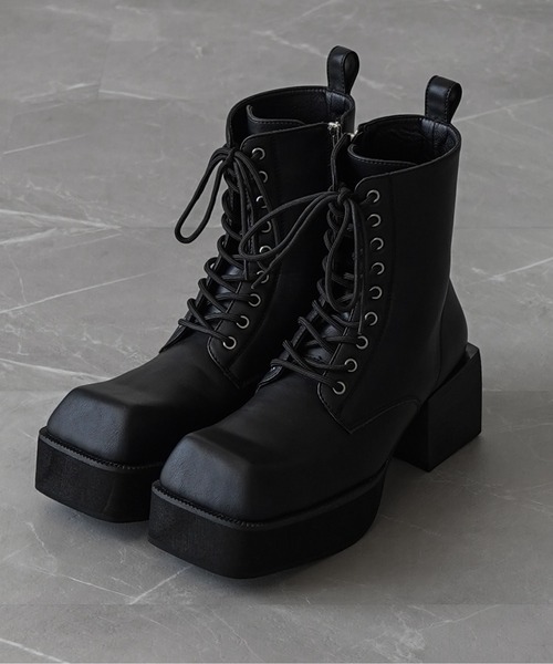 -ELLUV- 2025 Autumn/Winterインパクト溢れるオリジナルのヒールを搭載した新型ブーツ。長い年月をかけ完成した、ディレクター最推しの一側が完成しました。-Design-ボリューミーなスクエアトゥが目を惹くヒールブーツ。見た目のデザイン性はもちろん、様々なパンツとの相性も考慮したスタイリッシュなルックスに。レースアップのハトメやサイドジップはシルバーカラーで統一し”ELLUVが表現するモード感”を楽しんでいただけます。ジッパーの引手にもこだわり、細部まで高級感を追及しています。見た目にもインパクトのあるデザインソールはオリジナルで起こしております。ブーツらしくアウトヒールは+7cmに設定。履くだけで自然にスタイルアップするのも魅力的。さらにサイズ23.5と24.5も展開し、メンズのみならずレディースにもお勧めしたい一足です。-Material-適度にマットさを残した表面光沢とスムースなイメージにこだわった控えめなシボ感など、クオリティにも妥協しない合成皮革(レザー調素材)を使用。ブーツにありがちな疲れやすい履き心地にも最大限配慮。安定した歩行感で、よくブーツを履く方はもちろん、初めてのブーツデビューにもお勧めです。-Coordinate-綺麗めとしてはもちろん、合わせるアイテム次第ではカジュアルに履き崩しても◎カラーは使い勝手抜群のブラック1カラー展開。様々なコーディネートに馴染みやすく、これからの秋冬はもちろん、ロングシーズン重宝間違いなしです。-Price-永く使えるクオリティーを追求しながら、まずは手に取ってもらいたくコストパフォーマンスを実現!よりこだわり抜いた素材とデザイン性、同ブランドで揃えたくなる他アイテムとの相性も注目してほしいラインナップです。※Attention※※撮影場所やライティング、お使いのモニター環境によって色の見え方が異なる場合がございます。◆ELLUV/エルヴ◆唯一無二のデザイン性/一切妥協しない高品質への追求。