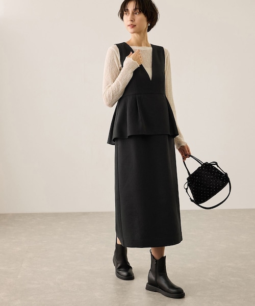 【素材感】 ・凹凸のあるツィーディーな素材感。 ・秋冬にぴったりな、温かみのある生地感。 ・程よい厚みでラインを拾いにくく、上品な印象をキープ。 【デザイン・シルエット】 ・ウエスト部分のペプラムディテールがポイントになったジャンパースカート。 ・スカート部分がアイラインになっているので全体に縦長シルエットとなり着やせも期待できる一枚。 ・深めのVネックはフロント部分のポイントになり、顔周りを女性らしい印象に見せ、アクセサリーも映えるデザインバランス。 ・程よい広がりで、甘すぎず上品な大人フェミニンを演出。 【カラー】 ・インナー色を選ばず合わせやすいブラック、チャコール、トレンドカラーのブラウンに加え、新色のグレーを追加した4色展開。 【スタイリングポイント】 ・リブインナーなどのコンパクトなニットとのコーディネートはワンピース自体のすっきりとしたシルエットを活かせるのでイチオシ。 ・タートルニットを合わせて、通勤にもおすすめの上品な秋冬の大人コーデに。 ・シアーレースカットソーを合わせて大人フェミニンスタイル。 ・足元はブーツなどと合わせたシンプルなレディスタイルがおすすめ。 ----------------------------- 裏地:あり 光沢感:なし 透け感:なし 伸縮性:なし ウエスト:ゴムなし ファスナー:後ろにあり ポケット:あり ボタン:なし 生地の厚さ:やや厚手 季節:秋、冬 ----------------------------- ※撮影時の光、お使いのモニター環境によって色の見え方が違う場合がございます。 ※新品番(GDE16080)と同型、素材違い。 【モデル着用サイズ】 グレー(07)着用モデル 身長172cm 着用サイズ:M その他カラー着用モデル 身長:168cm 着用サイズ:M 【2025 Autumn/Winter】【25AW】