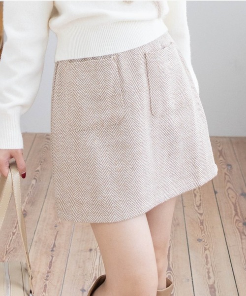 大きめポケットがアクセント!ヘリンボーンポケットデザインミニスカート【デザイン】フロントに大きめのポケットをあしらった、クラシカルな雰囲気のミニスカートです。程よく厚みのある生地感がシーズンライクで、スタイリングに季節感をプラスしてくれます。シンプルながらもデザイン性があり、トップスを選ばず着回しやすい一枚です。【素材感】着心地の軽いポリエステル素材伸縮性:なし/ 透け感:なし / 裏地:あり/ウエストゴム:バックのみあり 手洗いによる洗濯可 / ドライ・ウェットクリーニング可【コーディネート】コンパクトなニットと合わせれば、すっきりとしたシルエットでバランスの良いスタイリングに。オーバーサイズのカーディガンを羽織れば、抜け感のある大人カジュアルに仕上がります。ロングブーツやショートブーツを合わせれば脚長効果も期待でき、秋冬らしいトレンド感のあるコーデが完成します。【※お取り扱い上のご注意】1:モニター環境等により実際の商品と多少色味が異なって表示される場合がございます。予めご了承下さい。2:屋外で撮影された商品は、天候により多少実際のカラーと異なる場合があります。商品のカラーはトルソー(マネキン)の商品画像をご参照ください。3:濃い色の商品は、お洗濯や摩擦等による移染にご注意ください。4:末永くご愛用頂く為に、アテンションタグ・洗濯ネームを必ずご確認の上、着用又はお取り扱い下さい。5:生産時期により、色、サイズ、デザイン、素材の質感が多少が異なる場合がございます。あらかじめ御了承下さいませ。