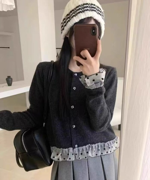 ドット×ギンガムの遊び心が満点!アソートフリルニットカーディガン【デザイン】裾と袖口にあしらわれたフリルがポイントのニットカーディガンです。ドットやギンガムを組み合わせたデザインフリルが韓国ガーリーな雰囲気を演出。さらに、愛らしいボタンディテールにもこだわりが詰まっていて、羽織るだけで特別感のあるスタイルに仕上がります。【素材感】着心地が柔らかいアクリル素材伸縮性:あり/ 透け感:なし / 裏地:なし 手洗いによる洗濯可 / ドライ・ウェットクリーニング可【コーディネート】ミニスカートとロングブーツを合わせれば、韓国アイドル風のガーリーコーデが完成します。ワンピースに羽織ってフェミニンにまとめるのもおすすめ。デニムを合わせて甘さをほどよく抑えたミックススタイルも、こなれ感が出て◎【商品の特徴】ドットチュールチェックフリルレイヤード風カーディガン【※お取り扱い上のご注意】1:モニター環境等により実際の商品と多少色味が異なって表示される場合がございます。予めご了承下さい。2:屋外で撮影された商品は、天候により多少実際のカラーと異なる場合があります。商品のカラーはトルソー(マネキン)の商品画像をご参照ください。3:濃い色の商品は、お洗濯や摩擦等による移染にご注意ください。4:末永くご愛用頂く為に、アテンションタグ・洗濯ネームを必ずご確認の上、着用又はお取り扱い下さい。5:生産時期により、色、サイズ、デザイン、素材の質感が多少が異なる場合がございます。あらかじめ御了承下さいませ。