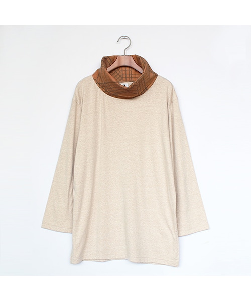 2014年秋冬シーズンに、名古屋のセレクトショップ『UNEVEN』主導のもと、幾つかのブランドが集まって行われた催し「Hello TOKAI」。東海地方の‘良いもの’をファッションに落とし込むというこのイベントにてSasquatchfbrix.が生みだしたのが、岐阜県にて現在も伝統的な技術をもとに「大柿鞄」として柿渋染の生地や鞄を企画、生産している『岡田防水布店』による柿渋染めのオリジナル生地。その生地を使用したアイテムは先シーズン(2015春夏コレクション)でもリリースされ、今期もまた、新たなフィルターを通してプロダクトが生まれました。今期は柿渋染めの生地をタートルネックに使用した七分袖のカットソー。生地独時の雰囲気と表情は、その面積は小さいながらもしっかりとした存在感となり、スタイリング全体のアクセントになってくれます。柿渋の中に含まれるタンニンという成分は防水、防腐、防虫効果があり、日本の伝統と工夫、実用性などをしっかりと踏襲しています。ボディーにはネップ混の柔らかい生地を使用し、ややゆったりとしたシルエットのサイジングと相まって着心地も抜群。両サイドに搭載された大きめのスリットも今の気分です。一枚で着るのはもちろん、今期コレクションの中でも独特の異彩を放つノーネックのジャケットなどと合わせるものおすすめです。