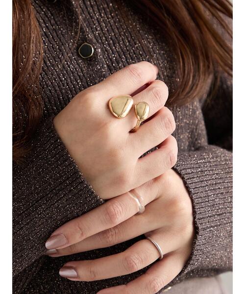 大きさの異なるツインビーンがニュアンスを演出するリング。程よく存在感のあるサイズで、1つ着けるだけで煌びやかな輝きを放ちます。締め付け感の少ないデザインが魅力的。いつものコーデにプラスするだけで、華やかな印象を与えるアイテムです。※商品画像は、撮影環境やお客様のご利用のPC・スマートフォンのモニター環境などにより実物と色味に差異がある場合がございます。