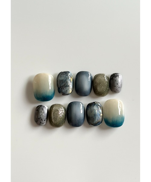 海底のような深い青のデザインです。 手作業でインクやジェルを動かしてその時だけの特別なデザインが出来上がります。世界に一つだけのデザインをお楽しみください。 粘着シール付きなので届いてすぐにお使いいただけます。 サイズについて 【ベリーショート】 S...25459 M...15468 L...03247 横幅/長さ 0...16/18 1...15/17 2...13/15.5 3...12.5/15 4...12/14.5 5...11.5/14 6...11/13 7...9/12.5 8...8/12 9...7.5/11.5