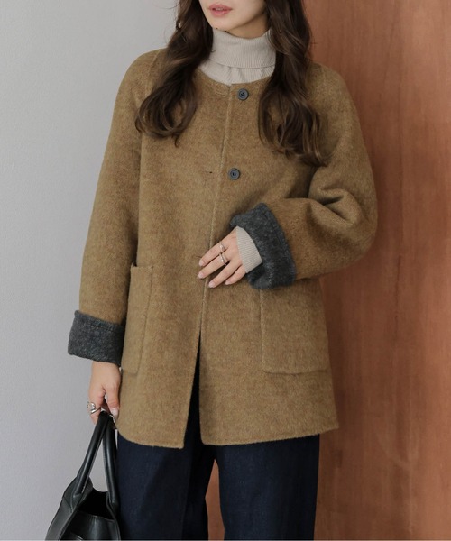 リバーシブルで着まわせる ノーカラーコート 異なる配色デザインでリバーシブルで楽しめるアイテム。 袖口を少し折って配色デザインを魅せる着こなしが今期のトレンド♪ ノーカラーデザインが顔回りをすっきり見せ、 シンプルでありながらも、計算された上品なシルエットが魅力。 Point 01 コーデのアクセントに 裏面の配色がポイントのアイテム。 袖口をまくって裏面を見せると こなれた印象を演出。 派手過ぎず、ナチュラルな配色カラーで、 程よいアクセントに ピッタリなデザインです。 Point 02 すっきりしたネックデザイン ノーカラー仕様なのでマフラーや ストールを合わせてもすっきり見え、 首元の配置も楽しめます。 【25AW】 ■Fabric ほど良い起毛感のふんわりした柔らかい生地 --------------------- 透け感:なし 裏地:リバーシブル 厚さ:普通 伸縮性:なし --------------------- ▼《お気に入り登録》でお得な情報がいっぱい▼ ・「商品のお気に入り登録」で再入荷通知や、ラストの通知、セール通知も受け取ることができます。 ・「ブランドのお気に入り登録」で新商品や再入荷など、お得な情報を受け取ることができます!