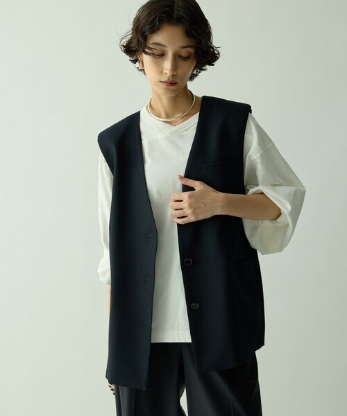 【2025AW】 ワイドシルエットがサマになるツイードライクベスト ■高機能な素材で仕立てたワイドベスト。 ■ウールツイードのような張り感とドライさのある軽いツイードライク素材を使用。 ■大きめな肩幅と肩パッドが特徴的なシルエットは、嬉しい小顔効果も◎。 ■一枚でもサマになるワイドシルエットで、ノースリーブトップスとしても着用可能。 ■広めのアームホールで、Tシャツやブラウス、ロンTEE、ニットなど様々なアイテムとのレイヤードもおすすめ。 ■きれいめなスタイルからカジュアルな着こなしまで、幅広く活躍できるアイテム。 ■同素材のドライツィーディPWショルダージャケット(ブランド品番:DNZ1052107A0006)もございます。 【MATERIAL】 梳毛調のトリクシオンと中空糸のオクタを配列して、ウールツイードのような張り感とドライさのある軽いツイードライク素材。 ・トリクシオン:ウールの長所を受け継ぎ、ポリエステルの長所を生かした素材。優しいタッチ・自然な外観とストレッチ機能による動きやすさと美しい仕立て映えを両立。 ・オクタ:軽量で保温性・吸汗速乾性に優れた、特殊な断面形状を持つポリエステル繊維。 ---------------------------------------------------- 洗濯方法:ドライクリーニング 透け感:なし 裏地:あり 伸縮性:なし 光沢感:なし ---------------------------------------------------- 【注意事項】 ・画像の商品はサンプルです。実際の商品と仕様、加工が若干異なる場合があります。 また 、パソコンやスマートフォンのモニター環境などにより、色味が違って見える場合があります。 ・店頭及び屋外での撮影画像は、光の当たり具合で色味が違って見える場合があります。 商品の色味は、スタジオ撮影の画像をご参照ください。 ・入荷状況により、お届け予定が前後する場合があります。 ・お客様への発送が店頭販売より遅れる場合があります。 ・追加生産商品は、一部の店舗、通販で販売中の場合があります。 予めご了承下さい。 【気になるアイテムは、「お気に入り」登録を】 ハートマークをクリックしておくことで、スムーズにお買い物が楽しめます。 ・ラスト一点のお知らせ ・再入荷のお知らせ ・SALEのご案内