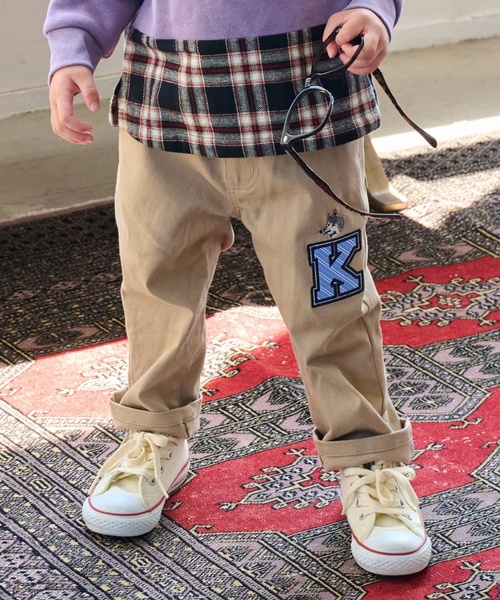 【トラッドライン】ロング丈ストレートパンツ。トラッドラインのストレートは既存のストレートシルエットとは異なるパターン。太すぎず細すぎない、まっすぐなラインが特徴で、どんな体型にも比較的合わせやすいのが魅力です。上品な印象でカジュアルながらも上品さを保っており、さまざまなシーンで活躍します。テーマを象徴するオオカミの刺しゅうに、レジメンタルなファブリックでブランドのイニシャル【K】のワッペンをアクセントにしたトラディショナルなデザイン。後ろポケットにはオオカミの織りネーム。内側にお名前を記入できるタグつき。【おすすめの着用時期は秋冬シーズン】【透け感】透けない【生地の厚さ】普通【伸縮性】あり【裏地】なし【ポケット】あり【アジャスター】あり