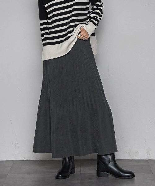 【デザインPOINT】 「しなやかに揺れて、気分まで色づく」スウェードライクな質感と、女っぽいシルエット、気分色づく消しプリーツスカート。 裏無しで初秋から、軽やかにシーズンムードを楽しめる一着。 腰回りは細かくすっきりと、裾に向かってプリーツ幅を広げて波打つシルエットを表現したパターン。 ウエストは総ゴムでストレスフリー、内側のコードで調節も可能です。 【スタイリング】 ショート丈トップスから、ざっくりニットまで、スタイリング自在なアイテム。 ブーツにもスニーカーにもマッチします。 【素材の特徴】 【Peスウェードライク】 ピーチタッチでスウェードライクな、ポリエステル素材を使用。 しなやかな薄地で、裏側がサテン地で滑りが良いのも魅力。 ---------------------------------------------------------------- 洗濯方法 家庭洗濯:液温は40℃を限度とし、手洗いができる。 自然乾燥:日陰の吊り干しがよい。 アイロン:アイロン仕上げ禁止。 ドライクリーニング:石油系溶剤による弱いドライクリーニングができる。 ---------------------------------------------------------------- ■モデル身長 166cm 170cm / 着用サイズ M ※画像の商品はサンプルとなりますので実際の商品と仕様、加工、サイズが若干異なる場合がございます。 ※お客様のモニター環境により実際のお色と多少異なる場合がございます。 ※撮影状況や光の当たり具合により、色合いが異なって見える場合がございます。 ---------------------------------- ▼商品のお気に入り登録 ハートマークをクリックし、お好きなカラーを選んでお気に入りに登録 完売カラーの再入荷通知や、ラスト1点の通知、セールの通知も受け取ることができます。 ▼ブランドのお気に入り登録 新商品や再入荷等、いち早くブランドのお得な情報を受け取ることができます。 ----------------------------------