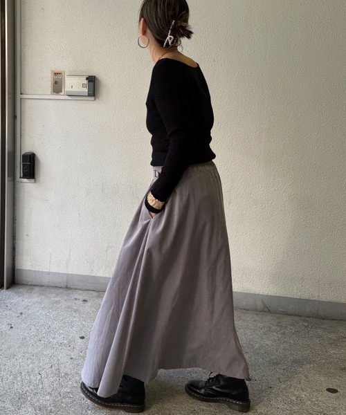ほんのり起毛感のあるピーチツイル素材で仕立てた、上品なフレアスカート。タックを効かせたシルエットがふんわり広がり、動くたびに美しい揺れを演出します。サイドのベルトデザインがさりげないアクセントとなり、トップスをインした着こなしにも映える一枚。きれいめにもカジュアルにも合わせやすい万能スカートです。【素材】軽くて微起毛のピーチツイル。【デザイン】フレアロングスカート。【ポイント】気になるウエストまわりをさりげなくカバーするタック使いで、サイドにはベルトを付けてデザインアクセントにしています。ボリュームトップスでも短丈でもサマになる着こなしの幅が広いスカートです。[洗濯方法]洗濯の際はネットを使用してください[クリーニング]洗濯機洗い可(非常に弱く)、ドライクリーニング可(F)、ウェットクリーニング(W)