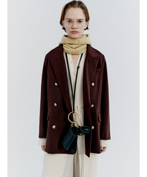 【サスティナブル】【人気のロング丈。ブランドのアイコン的アイテム・金ボタンブレザーを、新素材&新ディテールにアップデート】【Design/Styling】毎年大好評の、金ボタンのダブルブレザー。本格的なテーラードのディテールを取り入れた、価値ある一着です。今年はさらにバージョンアップし、裏地やディテールに至るまでこだわりました。『Mila Owen』のブランドネームをジャガードで表現した裏地や、さりげなく“MLO”と刻印したオリジナルの金ボタンを採用。また、袖の裏地はストライプ地にして、袖をロールアップして着たときにもさりげないポイントになるよう工夫しています。内ポケットは、三角フラップの仕様で高級感があり、ちらりと見える部分にまで、こだわりを感じさせてくれます。合わせるアイテムを選ばず、さっと羽織ればこなれて見えるうれしい1着。オンでもオフでも自在に着回せます。こちらはお尻が隠れるくらいのロング丈ですが、コンパクトな丈感の金釦ダブルブレストブレザー(09WFJ261903)もあります。【Fabric】今年は、リサイクルポリエステルを使用したサスティナブルな素材にアップデート。レーヨン混で上品なツヤ感もあります。カラーは3色をご用意。エレガントな印象の<IVR>、トラッド感が今年らしい<BRW>、クラシカルな定番の<DNVY>で展開しています。※照明の関係により、実際よりも色味が違って見える場合があります。またパソコン・スマートフォンなどの環境により、若干製品と画像のカラーが異なる場合もございます。予めご了承ください。商品の色味は、商品単品画像をご参照下さい。 ※商品画像はサンプルのため、色味やサイズ等の仕様に変更がある場合がございますので、予めご了承ください。