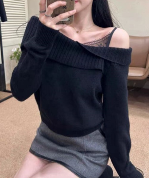 ◆DETAIL◇一枚でコーディネートが完成するレースキャミソールを重ね着したようなドッキングデザイン。デコルテラインを美しく見せるオフショルシルエットが、女性らしくヘルシーな肌見せを叶えます。デコルテをきれいに見せてくれるオフショルと、レースの甘さが絶妙にマッチした大人ガーリーな1枚です。ざっくりとした太めのリブ襟が、肩周りに程よいボリュームをプラスし、華奢見え効果を演出!柔らかいニット素材で着心地も良く、女性らしさを引き立ててくれます。チラリと覗く繊細なレースが、カジュアルなニットスタイルに上品なフェミニンさをプラスし、ボディラインに優しく沿う程よいフィット感とウエスト周りをすっきり見せる着丈で、ハイウエストのボトムスとも相性抜群です♡◆COORDINATE◇①【ガーリーフェミニン】フレアスカートと合わせて、とことん甘めなガーリースタイルに。ブーツで秋冬らしさをプラス。②【きれいめ】タイトスカートを合わせて、大人っぽさを引き立てる上品コーデに。ちょっとしたお出かけにも◎。③【フェミカジ】デニムに合わせて、レースの甘さをカジュアルダウン。大人可愛いデイリースタイルに。【色展開】・アイボリー・ブラック・グレー・レッド◆着用レビュー◇【スタッフA:身長155cm/骨格ウェーブ】肩がきれいに見えてすっきり!レースがついてるので露出感も気にならず着やすいです!程よいフィット感で体のラインを拾いすぎず、スタイルアップできました。寂しくなりがちなデコルテ周りを、ボリュームのあるオフショルリブとレースが華やかにカバーしてくれます。肩を少し落として着ることで、首回りの華奢さが強調され、重心が上がって見えるので脚長効果も抜群です。ハイウエストのミニスカートやフレアスカートと合わせるのがおすすめ♡【スタッフB:身長160cm/骨格ストレート】レースのおかげでニット1枚でも華やか。スカートにもパンツにも合わせやすいので着回しやすいです!骨格ストレートさんが得意な「適度な肌見せ」ができるデザインです。幅広のリブ襟が、気になる二の腕の外側を程よく隠してくれるので、上半身がガッチリ見えず、むしろスッキリとした縦のラインを強調できます♡レースがV字のように配置されているので、首が長く見えるのも嬉しいポイント◎◆POINT◇・レース×オフショルのフェイクレイヤードデザイン・甘さと大人っぽさを両立した1枚・ニット素材で着心地も◎・スカートにもパンツにも合わせやすい・デイリーからお出かけまで使える◆キーワード・オフショルニット・レースレイヤード・大人ガーリー・フェミニンニット・フェイクレイヤード・デイリーフェミニン・甘辛バランス・華やかトップス・ガーリートップス・秋服・冬服※生産の特性上、商品画像との色差が多少出る場合がありますのでご了承ください※着用身長によって画像イメージと異なる場合があります。 ※撮影環境により、実際のカラー、形状、デザイン等多少異なる場合がございます。 《 お知らせ 》 ▼商品のお気に入り登録 お気に入りアイテムの値下げ・再入荷・在庫1点などの通知を受け取ることができます。 ▼ブランドのお気に入り登録 新商品や再入荷、セール、クーポン配布などお得な情報を受け取ることができます。是非、お気に入り登録してみてください!※他のキャンペーンにより、期間中に価格が変動する場合があります。※セールは予告なく終了させていただく場合もあります。※ご注文いただいた予約商品のお届け時期の確認は、注文履歴ページより行えます。※ご注文いただいた予約商品のお届け時期の確認は、注文履歴ページより行えます。
