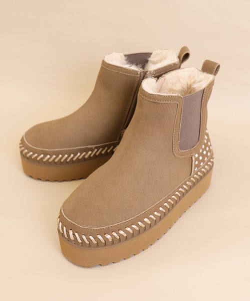 《デザイン》・厚底でスタイルアップ効果抜群のフェイクムートンショートブーツ。 ・内側はフェイクファーでふかふかの履き心地。寒い冬でも足元から暖かく過ごせます。 ・クラフト感のあるソールのアウトステッチと、かかと部分のスタッズがスタイリッシュなアクセントをプラス。 ・足首周りのストレスを軽減するサイドゴアと内側ファスナーで脱ぎ履きもスムーズです。 ・ソックスとの相性が良く、ルーズソックスと合わせるとトレンド感のあるスタイルに。 ・ベーシックなカラー展開でどんなコーデにも合わせやすい使い勝手のよいアイテムです。 《機能性》 ・軽量で柔らかな約4cmの厚底で、スタイルアップしつつ長時間楽に履いて頂けます。 ・クッション性の良い全面5mmのカップインソールを使用しています。 ※雨や雪により、シミになってしまう可能性がございますのでご注意下さい。 ※内側は毛足の長いフェイクファー素材のため、使い始めは毛が抜ける場合がございます。予めご了承ください。 ※かかとのストーンは繊細なため強い衝撃・摩擦にご注意ください。 ※撮影環境により、光の当たり具合で色味が違って見える場合があります。あらかじめご了承下さい。 -INFORMATION- ◆商品のお気に入り登録 完売していても再入荷通知を受け取ることができますので、是非ご登録ください! ◆ブランドのお気に入り登録 新商品や再入荷など、お得な情報を受け取ることができます。