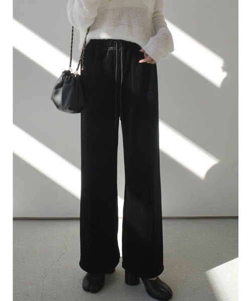 【デザイン&ディテールポイント】 シーズンムード高まるベルベット素材を使用したロングパンツ。 ウエストはドローストリングで、ストレスフリーな履き心地を叶えながらも、落ち感のあるストレートシルエットが洗練された印象に。 程よい抜け感とベルベットの洗練された印象を兼ね備えた一着です。 【コーディネートポイント】 同素材の「velvet lace tank top」とのセットアップコーデで、抜け感のある大人フェミニンな雰囲気に。 ルーズなトップスと合わせても、落ち感のあるストレートシルエットが全体をすっきりとした印象に仕上げます。 カーディガンやジャケットを合わせれば、洗練された秋のコーディネートが完成。 ※セットでの購入は単品買いに比べ3,000円お得に購入ができます。