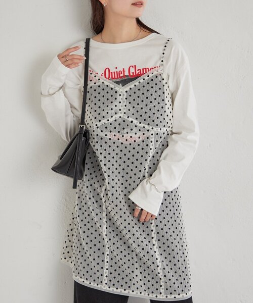 レトロムード漂うドット柄が可愛いキャミチュニック!●デザイン・バストラインを綺麗に魅せるカッティングで女性らしいシルエットに。・軽やかな素材感で、季節を問わずレイヤードしやすいアイテム。・華奢なストラップが抜け感を演出し、フェミニンさをプラス。●スタイリング・タートルネックをインしてクラシカルムードな着こなしに。・上からスウェットを重ねて、カジュアルダウンするのもおすすめです◎・ニットカーディガンを羽織って、柔らかい印象の大人可愛いスタイルに。●おすすめスタイリングアイテムビューティーフレアデニムスリットミニスカパンプレート付きクルーリブニットプレート付きハイネックリブニット●スタッフ着用コメント身長162㎝ 骨格ナチュラルコンパクトなトップスの上に重ねて、ドットデザインを引き立てると◎シアー素材なので、ロゴロンTを合わせてロゴが透けて見える感じも可愛いです!身長153㎝ 骨格ウェーブ少しオーバーサイズのトップスの中に合わせて裾をレイヤードしてトレンドライクに。ミニボトム合わせも可愛らしくフェミニン感があるスタイリングになります!●素材-----------------------------------------------------洗濯:40度限度 手洗い/石油系ドライクリーニング可アイロン:低温120℃まで(あて布使用)タンブル乾燥:不可裏地:なし伸縮性:なし光沢感:なし生地の厚さ:普通------------------------------------------------------商品のお気に入り登録➡ お気に入りアイテムの値下げ・再入荷・在庫1点などの通知を受け取ることができます。ブランドのお気に入り登録➡ 新商品や再入荷、セール、クーポン配布などお得な情報を受け取ることができます。※サイト上のカラー名と、お届け商品に記載されているカラー名が異なる場合がございます。※商品の色味は、撮影場所や光のあたり具合などにより色味が違って見える場合が御座います 。 また、お客様のお使いのPCのモニター環境などにより色味が違って見える場合が御座います。予めご了承の上ご注文下さい。※ご注文いただいた予約商品のお届け時期の確認は、注文履歴ページより行えます。------------------------------------------------------
