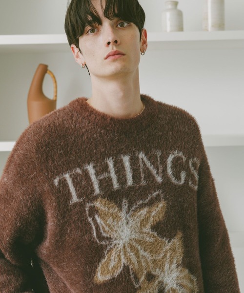 シャギーニットを使用した季節感のあるデザインニット。 フラワーデザインが主役の一枚です。 ーーー ■ポイント シャギーニットを使用した季節感のあるデザインニット。 つい触りたくなるようなふわふわとした肌触りの良さが特徴で、これからの季節にぴったりです。 フロントに大きく施したフラワーデザインが目を引き、一枚でトレンドを取り入れられる一着です。 ゆったりとしたオーバーサイズなので、一枚着としてはもちろん、インナーとして使用して柄をちらっと見せるスタイルもおすすめ。 ■素材 ふっくらとした毛足の長いシャギーニットを使用。 季節感のあるボリュームのシャギー生地は、程よい光沢もあり上品な雰囲気を演出します。 さらに二色以上の糸で編み立てることで、より深みのある色合いに仕上げました。 ウールを混紡していないのでニット特有のチクチクとした感覚も少なく、快適にご着用いただけます。 ====== ■参考サイズ M:~175cm L:175cm~ ====== ーーー ■スタイリング 上品なシャギーニットは、きれいめなパンツと合わせるのがおすすめです。 ふんわりとした生地なので、ハリ感のあるスラックスと合わせると、メリハリのある大人スタイルが完成。 リラックス感のあるスタイルがお好みの方は、デニムパンツと合わせて頂くこともできます。 自然なオフ感が生まれ、デイリースタイルにぴったりな印象にまとまります。