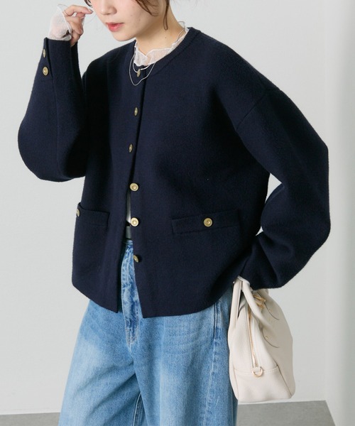 ピュアルセシン 2025 AW collection【Grace of Refined】◇気品溢れるジャケット見えニットカーディガン◇●商品のお気に入り登録クーポンやタイムセール、再入荷通知やラスト1点などお得な情報を受け取ることができます。ご登録をお忘れなく◎⚫︎デザイン上質なイメージのあるミラノリブのニットに、味のあるゴールドのボタンが映えるジャケット風のカーディガン。滑らかで生地のように見えるミラノリブ編みは、ラフな着心地ながら、かっちりしすぎないきちんと感が叶う大人女性におすすめのニットです。身幅やアームにゆとりを持ったサイジングなので、ブラウスやカットソーとの着合わせてもスムーズに着脱でき、気軽に羽織れます。程よい厚みでアウターのインにも活躍します。⚫︎スタイリングフロントの金ボタンが着映えるニットカーディガンはコーディネートの主役に持ってくるのがおすすめ。ブラウスとスラックスならパンプスを合わせてきちんと見せに。デニムパンツとならブーツでカジュアルな着こなしが楽しめます。スカート合わせならレディライクなスタイリングも◎同素材のNo.0252010040のミラノリブニットスカートを合わせると、セットアップで着用して頂けます。⚫︎素材12Gの糸を使用し、編み地のフラットなミラノリブ編みで作られたニット。程よい膨らみのあるニットで、スウェットとカットソーの中間ほどの厚みがあります。===============================洗濯方法:手洗い/ドライクリーニング/ウェットクリーニング透け感:なし伸縮性:あり光沢感:なし生地の厚さ:普通【スタッフコメント】年齢:40代前半/身長:154cm/普段着用サイズ:Mサイズサイズ感:身幅と袖幅にゆとりがあり、ブラウスを押さえつけずに着られました。アームも広く、ドロップスリーブのトップスの上にでもすんなりる大きさです。==============================※着用、お取り扱いの際は、商品についている品質表示とアテンションタグを必ずご確認下さい。※撮影場所やお使いのモニター環境により若干お色味が異なる場合がございます。特にロケの撮影では明るく見える傾向にございます。 ※予約商品はサンプルで撮影をしております。若干の仕様が変更になる場合がございますので予めご了承の上ご注文くださいますようお願いいたします。【予約品の入荷時期について】店舗入荷時期と予約商品のお届け時期が異なる場合がございますので、予めご了承ください