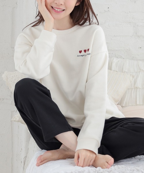キュートなワンポイント 【デザイン】 トップスはゆるいワンポイント刺繍がかわいいデザイン♪ ボトムスはシンプルな無地のバリエーション。 リラックスタイムにぴったりの、ラクチンな着心地♪ 【素材・機能】 秋から春まで長く使える、肌触りの良い綿100%の裏毛素材。 ボトムスには嬉しいポケット付き! 【スタイル】 トップスは普段着としての着回しにも活躍! お休みの日もボトムスを変えれば、ちょっとしたお出かけも楽々♪ ※ボトムス:ウエスト部分ゴム ※トップス:裾両脇スリットあり(7cm) 品番:226-135-9299