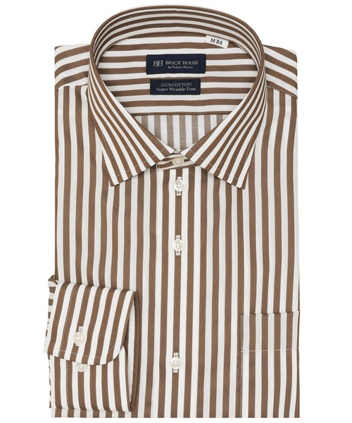 ◆綿100% 超形態安定シャツ◆ 綿100%なのにお手入れ簡単 メンズ超形態安定シャツ 通常の形態安定加工商品よりもさらに 高い形態安定性(W&W性)を取得。 着心地の良さと高い機能性、両方を 追及した価値ある逸品をお届けします。 はっきりとしたブラウンストライプ柄は スラックスやチノパン等、ボトムスを 変えることでコーデの幅が広がります。 シーン問わず着用できる万能なワイド衿 はクラシックなビジネススタイルにも ピッタリな使いやすい衿型です。 ■仕様 カフリンクス使用可能な兼用カフス (アジャストボタン) 中丸カフス 胸ポケット(左胸)付き(ホームベース型) 背タック・背ダーツなし 衿キーパー:差込式(予備なし) 前立:裏前立仕様 ※サイズ[首回り42cm]のお届け商品の縫い付けタグはLL表記、 サイズ[首回り43cm]のお届け商品の縫い付けタグはXL表記でございます。 ZOZOTOWNの検索サイズと異なりますのでご注意ください。 【BRICK HOUSE by Tokyo Shirts / ブリックハウス バイ トウキョウシャツ】業界トップ水準を誇るノーアイロンの形態安定加工は自宅で洗濯可能でお手入れ簡単!高度な縫製技術を用いた高付加価値シャツでありながら選ぶことを気軽に楽しめます。ベーシックから多様なデザインまで幅広いバリエーションで豊富なサイズ展開で、ディテールの隅々にまで織り込んで一枚一枚丁寧に仕立てられたシャツです。
