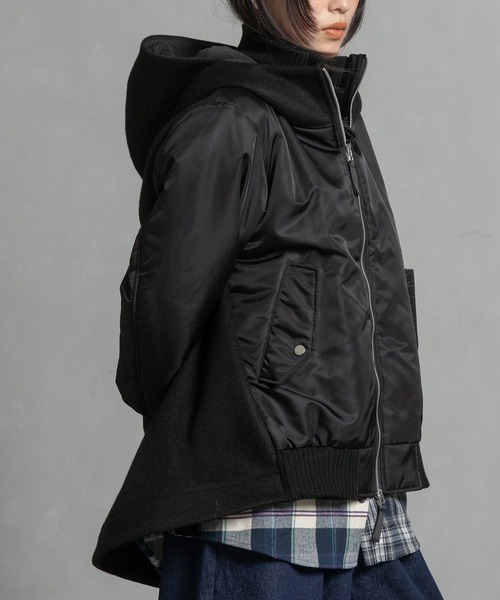 ■2025 AUTUMN WINTER collection■光沢タフタ×ウールライクなメルトンコンビネーションMA-1デザインを取り入れたフードブルゾンたっぷりとした身幅と長めの着丈が、身体を優しく包み込むフード付きジャケット。素材の表情と配色のニュアンスが、スタイリングに奥行きをプラス。前後で印象が異なるデザインや、レイヤードにも対応するゆとりのあるシルエットが魅力。羽織るだけで、こなれ感のあるスタイルが完成する一枚です。*画像のブラックはフード衿部分の素材がメルトンになっておりますが、製品は前身頃・袖と同様の素材になります【DESIGN】■リブスタンド衿をレイヤードした大きめのフードで小顔効果■前身頃はジグザグステッチの持ち出し付きのファスナーで、前を開けて着るとディテールポイント■後身頃は、ウォーム感たっぷりのウール見えするメルトンで切替え、ボックスタックを入れ、裾に向かってAラインに広がるシルエット■後下がりの丈感で気になる部分をカバー■スタンド衿、前裾、袖口はリブニットを使用したメリハリのあるデザイン■ドットボタン留めのフラップポケット■前身頃のみ裏付き【MATERIAL】(表地: 身頃 / フード)光沢感のある中肉ナイロンツィル素材を使用・ハリ感がありシルエットが出る・丈夫で綺麗目な表面(別地: 後ろ身頃)高級感あるウールライクなメルトンを使用・微光沢で柔らかく滑らかな肌触りが特徴・保温性や撥水性に優れた素材--------------------------裏地:前身頃のみあり光沢感:あり透け感:なし伸縮性:なし生地の厚さ:中肉厚ケア方法:クリーニング--------------------------◆お取り扱いについては商品についております品質表示にてご確認下さい。*光のあたり具合いやパソコンなどのモニター環境によって実際の色味と異なって見える場合がございます。予めご了承ください。*撮影時はサンプルの為、若干のデザイン変更等ある場合がございます。予めご了承ください。<INFORMATION>◆商品のお気に入り登録お気に入り登録していただいた商品は、完売商品の再入荷通知やラスト1点の通知、またクーポン発行やタイムセールの通知もお届け!ぜひご登録してください。◆ショップ・ブランドのお気に入り登録新商品や再入荷、ショップ・ブランドのお得な情報をいち早お届け!ぜひご登録してください。
