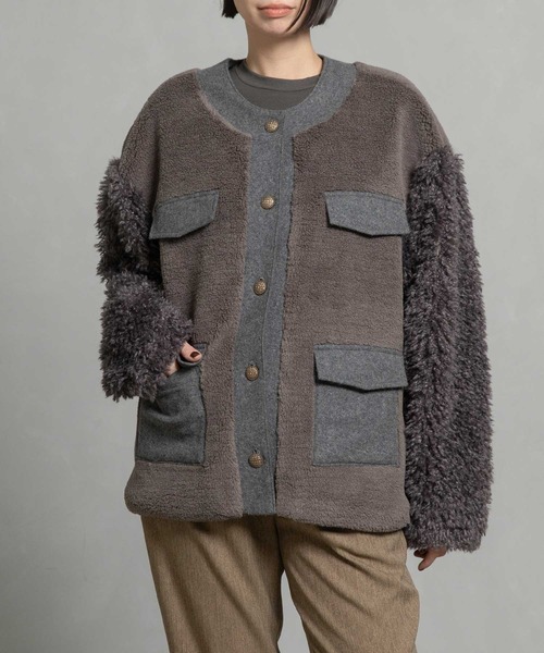 ■2025 AUTUMN WINTER collection■ ボア×シープフェイクファー×圧縮天竺の3素材をコンビネーションしたアウター アンティークゴールドのメタルボタンがヴィンテージな雰囲気 3種の異素材を組み合わせた、表情豊かなオーバーサイズジャケット。ふわっとしたボア、なめらかなシープフェイクファー、そして程よいハリ感のある圧縮天竺が織りなす質感のコントラストが、スタイリングに奥行きを与えてくれます。たっぷりとした身幅と長めの着丈で、リラックス感と構築的な美しさを両立した一枚です。 【DESIGN】 ■身頃は毛足の短いボア素材で、オーバーサイズなのに程よいボリューム感 ■袖は、シープのような毛足の長いクルクルしたファーで、ボリュームのあるシルエットが目を惹くデザイン ■前立てとポケットには、フラット素材の圧縮天竺を使用 ■両脇裾はスリット開きで、後裾はゴム入りのギャザーでバルーンシルエット ■素材感でメリハリをつけたフェミニンで抜け感のあるアイテム ■両サイドポケット有り 【MATERIAL】 (表地) モコモコした肌触りが特徴のボアを使用 ・ボリューム感がありふっくらしている ・暖かみがあり、軽量(別地: 袖)シープの毛皮のような、毛足の長さや毛並みのカールが強いフェイクファーを使用 ・暖かみがあり、軽量 ・環境に優しいファー (別地: 衿 / 前立て / ポケット) ポリエステルとのウール混紡糸を天竺編みにし、圧縮加工した圧縮天竺を使用 ・ウールの暖かさや風合い ・耐久性、伸縮性、ハリ感、形状維持 -------------------------- 裏地:あり 光沢感:なし 透け感:なし 伸縮性:なし 生地の厚さ:肉厚 ケア方法:クリーニング -------------------------- ◆お取り扱いについては商品についております品質表示にてご確認下さい。 *光のあたり具合いやパソコンなどのモニター環境によって実際の色味と異なって見える場合がございます。予めご了承ください。 *撮影時はサンプルの為、若干のデザイン変更等ある場合がございます。予めご了承ください。 <INFORMATION> ◆商品のお気に入り登録お気に入り登録していただいた商品は、完売商品の再入荷通知やラスト1点の通知、またクーポン発行やタイムセールの通知もお届け!ぜひご登録してください。 ◆ショップ・ブランドのお気に入り登録新商品や再入荷、ショップ・ブランドのお得な情報をいち早お届け!ぜひご登録してください。