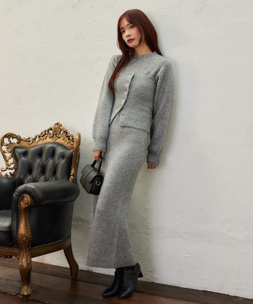 ホリデーシーズンにもぴったりなセットワンピース。■point・ビスチェがセットになったニットワンピース・スパンコールとラメ糸をミックスし、繊細なきらめきを表現しました・ボディカラーになじむシルバーラメを選ぶことで上品な印象に。・ビスチェは斜めの網柄で立体感をプラスし、ほどよい厚みのある生地で単体でも着回しやすい仕様にしました■stylingビスチェとセットで合わせれば華やかな印象で着ていただけます。ビスチェはボタン開きデザインで、下を開けてラップ風にも着こなせます。お持ちのシャツ等にビスチェのみ着回すのも◎※屋外の光や照明の当たり具合で、実際の商品の色味とカラー別画像の色味に若干の違いが発生する場合がござい 詳細画像と併せてご確認の上、ご注文いただきますようお願い致します。【INFORMATION】■商品のお気に入り登録完売していても再入荷時に再入荷通知を受け取ることができますので、是非ご登録ください!■ブランドのお気に入り登録新商品や再入荷などの情報を受け取ることができますので、是非ご登録ください!