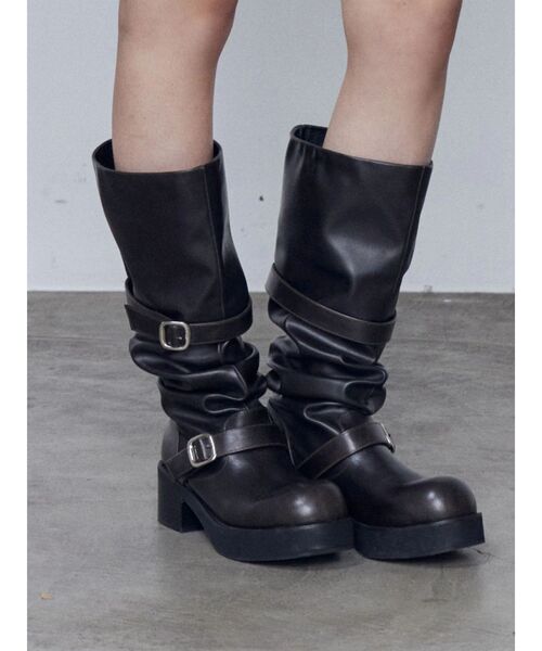 ルーズなシルエットが今季らしいブーツ■デザインベルトデザインがアクセントになり、シンプルながらも存在感のある一足です。エイジング加工の入った素材を使用しているのでカジュアルに合わせやすく抜け感のある雰囲気です。高すぎないソールで歩きやすく、デイリーにも取り入れやすいブーツです。※着用画像はフラッシュの加減で実際の製品と色味等が異なる場合がございますので、生地のズームアップ画像をご確認ください。 ※ご利用の端末画面の設定により実際の商品と色味が異なる場合がございます。