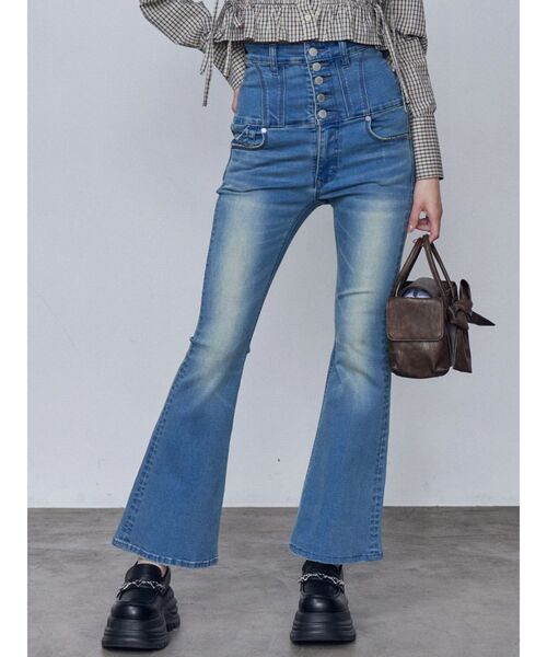 5つ釦デザインのスーパーハイウエストフレアパギンス■デザインクロップド丈との相性が良く春夏に使いやすい1本です。釦や切り替えのみをポイントにコルセットのようにウエストを綺麗に見せてくれます。程よくシェービングの加工も入れデニムらしい雰囲気を残したベーシックで着回しの効く1本です。しっかり伸縮性のあるストレッチデニ生地で履き心地もいいのが特徴です。 ■スタイリング5つ釦のハイウエストなので、アシンメトリーチョーカーギャザーニットのようなショート丈トップスとのスタイリングがイチオシ。足元はバルキープランプショートフィットブーツと合わせていただくと美脚効果も抜群です。※着用画像はフラッシュの加減で実際の製品と色味等が異なる場合がございますので、生地のズームアップ画像をご確認ください。※ご利用の端末画面の設定により実際の商品と色味が異なる場合がございます。【商品特徴】透け感:なし伸縮性:ややあり生地の厚さ:普通サイズ感:普通裏地:なしポケット:あり