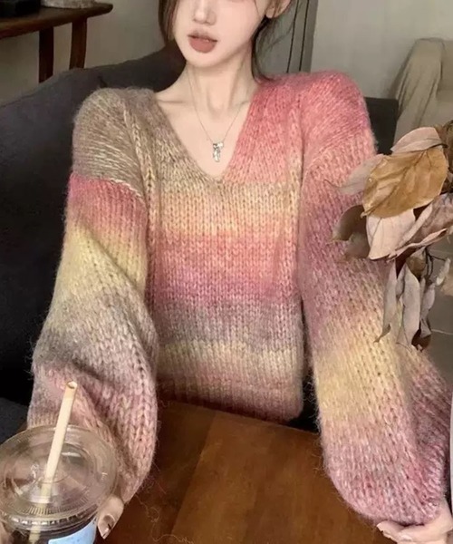 【EIZZ/アイズ】グラデーションカラー Vネック ルーズニット\ 幻想的なカラー♡ 纏うだけで華やぐグラデーションニット/このVネックニットは、複数の色が溶け合うような美しいグラデーションカラーが最大の特徴です単色にはない奥行きとニュアンスが、コーディネートを一気に華やかでロマンティックなムードに仕上げます。着るだけで気分が上がる、秋冬の主役級トップスです。■ 抜け感を演出! ざっくり編みとルーズシルエットざっくりとしたローゲージの編み地と、身体が泳ぐようなゆったりとしたルーズシルエットを採用しています。ドロップショルダーとボリュームのある長めの袖が、女性らしい華奢なラインを引き立て、程よい抜け感を演出します。ルーズなシルエットでもVネックで首元はすっきり見え、だらしなくなりません。■ 軽やかな着心地! 肌触りの良い薄手ニット薄手のニット生地を使用しているため、ボリュームがある見た目にも関わらず、軽やかな着心地が魅力です。厚手のニットのような重さがなく、重ね着をしてももたつきにくいのが特徴です。肌触りも柔らかく、長い期間快適に着用いただけます。■ ロマンティックな着こなしを叶える万能トップスデザイン性が高いため、シンプルなボトムスと合わせるだけでスタイリングが完成します。タイトスカートやミニボトムと合わせて甘めに、スラックスやデニムと合わせてカジュアルダウンするなど、様々なテイストで活躍します。冬の暗くなりがちなコーディネートに、鮮やかな色彩をプラスする一押しアイテムです。【EIZZ/アイズ ZOZOTOWN お買い物ガイド】▼商品をお気に入り登録▼完売商品の再入荷やラスト1点の通知、セール開始時にお知らせ!▼"EIZZ/アイズ"をお気に入りブランドに登録▼新商品や再入荷など、ブランド最新情報をいち早くお知らせ!是非、ご活用いただきお買い物をお楽しみください◎■撮影はサンプル品を使用しており実物とは若干異なる場合もございますので、ご了承ください。グラデーション Vネック ニット セーター ルーズシルエット オーバーサイズ ローゲージ ゆるニット バルーン袖 モヘア風 フェミニン カラフル トップス レディース