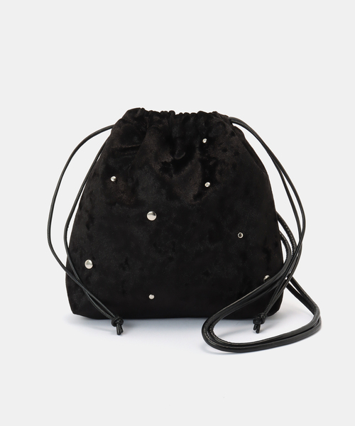 スタッズがアクセントになるミニ巾着バッグ。大小ランダム使いの丸型スタッズ配置なのでハードすぎず、こなれた印象になります。ベロア素材で季節感を演出し、その日のスタイリングに合わせてお使いいただけるハンドorショルダーの2WAY仕様です。※取り扱いについては、商品についている品質表示でご確認ください。※こちらの商品は、B.C STOCKでの取り扱いになります。 直接店舗へお問い合わせの際はB.C STOCK店舗へお願い致します。※照明の関係により、実際よりも色味が違って見える場合があります。またパソコン・スマートフォンなどの環境により、若干製品と画像のカラーが異なる場合もございます。※商品の色味は、商品アップ画像をご参照ください。本体:洗濯不可