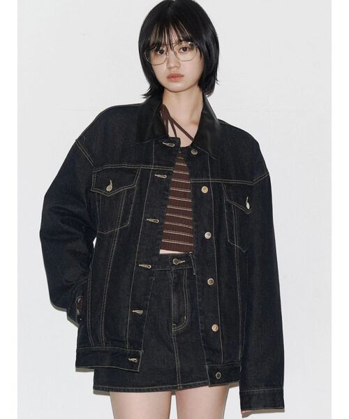 オーバーサイズのデニムブルゾンセットアップ着用アイテム↓デニムマイクロスカートミッドワイドジャストウエストジーンズ■デザイン衿のみ合皮を使用してデニムとのコントラストをポイントにしています。衿の合皮はラムレザーの様な柔らかい風合いを使用しているので首に馴染み綺麗にフィットしてくれます。シェービングの加工を控え上品な印象に仕上げています。■スタイリング同シリーズのデニムマイクロスカート・ミッドワイドジャストウエストジーンズとのセットアップスタイリングもおすすめです。※着用画像はフラッシュの加減で実際の製品と色味等が異なる場合がございますので、生地のズームアップ画像をご確認ください。※ご利用の端末画面の設定により実際の商品と色味が異なる場合がございます。【商品特徴】透け感:なし伸縮性:なし生地の厚さ:普通サイズ感:ゆったり裏地:なしポケット:あり