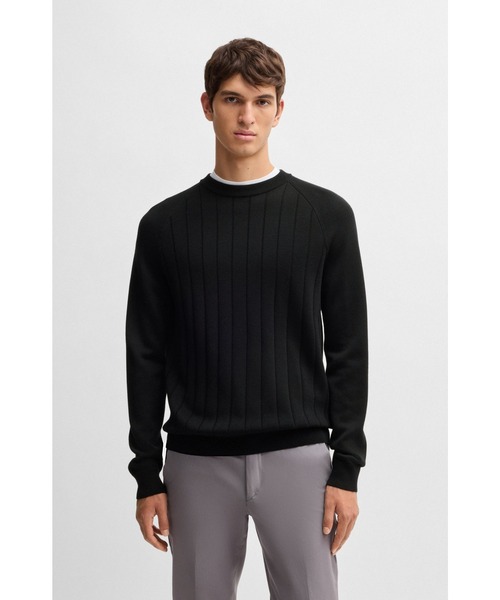 ストレートフィットにデザインした、BOSS Menswearのセーター。通気性の良いウール混紡ヤーンを使用し、身頃全体にストライプ柄を編み込んでいます。【BOSS Black】テーラリングに定評があるBOSS Menswearは、象徴的なスーツからカジュアル、スポーツウェアまで、多種多様なライフスタイルに沿った革新的なデザインを提案します。品番 50531162原産国 トルコ着用例 Size M H189 B94 W77 H94組成 ウール70%, 再生繊維(リヨセル)30%【お取り扱い上のご注意】摩擦により毛玉が発生しやすいため、連続のご着用はお避けください。また毛玉が発生した際は、手で引っ張らずに、小さなハサミや毛玉取器でお手入れしてください。素材の特性上、毛足の長い製品は他の衣類に付着する場合がありますので、ブラッシングして除去してください。濃色の製品は摩擦(特に湿った状態)や汗や雨などに濡れた場合、他のものに色移りする恐れがありますのでご注意ください。着用や洗濯で徐々に色あせや毛羽立ち生じます。また直射日光や蛍光灯に長時間あたると、色あせする場合がありますのでご注意ください。着用の際は、バッグやアクセサリー、表面の粗い物などへの引っ掛かりに十分にご注意ください。ボタンや装飾品へのアイロン掛けは、破損の原因になりますのでお避けください。また熱の影響で縮む性質がありますのでご注意ください。