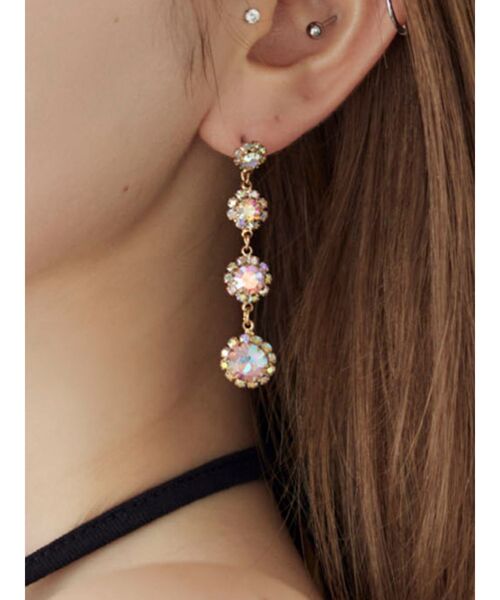 オーロラカラーで異なるサイズのビジューが連になった上品なビジューピアスです。存在感があり、縦長のラインが顔回りをスッキリと魅せ、パーティシーンのドレスアップをより華やかにプラスしてくれるアイテムです。