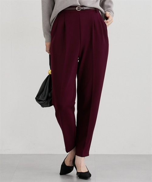 ■デザインオンからオフまで着まわせるツータック仕様のテーパードパンツ。落ち着いたブラウンカラー×ゴールドバックルがかわいい細めのベルト付きできれいめコーデにぴったりのアイテムです。■素材表面感のきれいなカットツイル素材を使用。細めの畝のある素材で通勤にも使えるカジュアルすぎない素材です。カットソーなのでストレッチ感があり着心地も快適。ネットに入れて洗濯機洗いOKなのでお手入れも簡単!■おすすめのスタイリングとろけるチョコレートをイメージした秋冬にぴったりのカラー展開が特徴のアイテム。ゆるっとトップスのときは少しフロントインにしてベルトを見せるとバランスよく着こなせておすすめです!<仕様>ポリエステル95%・ポリウレタン5% 透け感:なし伸縮性:あり生地の厚み:普通光沢感:なし裏地:なしポケット:あり(両脇)ウエスト:後ゴム季節:秋シルエット:普通<洗濯方法>洗濯機OK ネット使用■キーワード20代、30代、40代、きれいめカジュアル、きれかじ、オフィスカジュアル、キレカジ、テーパード、パンツ、ファッション、ボトムス、レディース、冬、大人、大人カジュアル、秋、通勤カジュアル
