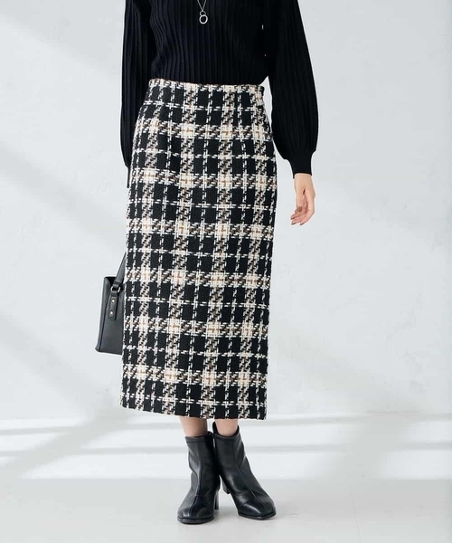 ◆トレンドと上品さを両立するツイードチェックスカート◆ 【デザイン】 ・きちんと感とこなれ感を両立するツイードナロースカート ・モノトーンベースのチェック柄とツイードで上品な印象 ・ふっくらとしたロービング糸を使用 ・女性らしいナローシルエット ・後ろゴムで穿き心地らくちん ・ダークグレーは(K2JKA16099 )とセットアップ着用可 【素材】 ・女性らしいツイード素材 ・表面感のある上品な風合い 【コーディネート】 同素材のジャケット(K2JKA16099 )とセットアップ着用がおすすめ。 ニットやブラウス、カットソーなど、トップスを選ばない着回し力の高さも魅力です。 きちんと感もありフォーマルな場やビジネスシーンに活躍してくれる華やかなスカートです。 【同素材シリーズ】 ◆ブークレノーカラージャケット:K2JKA16099 -------------------- 着用シーズン 春:○ 夏:× 秋:◎ 冬:◎ -------------------- 透け感:なし 裏地:あり 伸縮性:なし 光沢感:なし 生地の厚さ:やや厚め -------------------- ≪お気に入り登録機能の使い方≫ ■商品のお気に入り登録(ハートマークをクリック) 再入荷通知や値下げ等、お得なご案内を受けることができます。 -------------------- ※商品画像は、光の当たり具合やパソコンなどの閲覧環境により 実際の色味と異なって見える場合がございます。 商品の色味の目安は商品単体の画像をご参照ください。