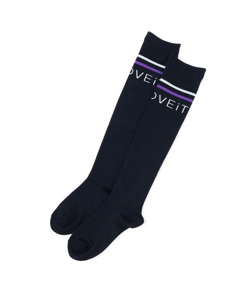 スタイリッシュなブランドロゴをあしらったニーハイソックスです。配色のダブルラインでスポーティー感を高めました。落ち着いたカラーリングで、クールな表情を持っています。ミニ丈のプリーツスカートやデニムパンツと好相性です。