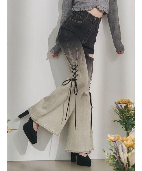 サイドの異素材のレースアップ紐で脚長効果抜群のデニムパンツです。ストレッチのある生地で腰と太もも回りはタイトです。膝上から広がるフレアシルエットなので、スタイルアップ効果も◎サイドの大胆なカットアウトがセンシュアルな雰囲気もプラス。BLKはグラデーション加工が施されておりコーデのアクセントになります。今季のラッフルアンサンブルなどのコンパクトトップスに合わせるのがオススメです。