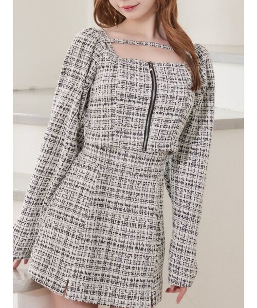 上品でエレガントなツイード素材で仕上げたコンパクトなトップスです。 胸元にあしらった同素材のストラップはデコルテをきれいに魅せてくれます。フロントのジップデザインは目を惹くポイントです。 きれいめスタイルにはもちろん、デニム等を合わせてカジュアルライクに着こなしても◎上品なコーデが完成する1着です。同素材で展開しているミニスカートとのセットアップスタイルもオススメです。----------------------------------------------♡商品のお気に入り登録完売カラーの再入荷通知や、ラスト1点、セールの通知をお知らせ致します。♡ブランドお気に入り登録新商品や再入荷など、いち早くブランドの情報を受け取ることができます。----------------------------------------------※サイズは、実寸サイズを測っているため多少誤差がでる場合があります。※重量は目安として、参考にして下さい。※商品画像は着用イメージです。 光や角度により、実物と色味が異なる場合がございます。 商品の撮影はサンプルで行っている為、カラーやサイズ等に変更がある場合がございます。 ご覧のモニター環境により実際の商品と多少色味が異なって見える場合がございます。