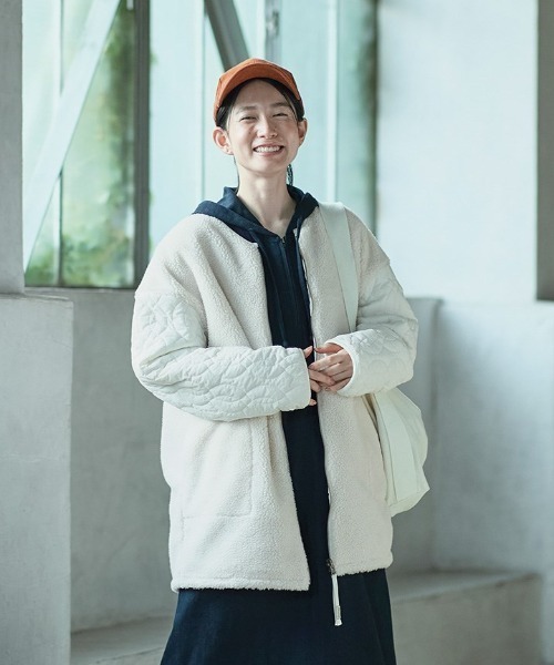 一着で二度おいしい。 ボアとキルティングの両方を楽しめるリバーシブルコートを作りました。 極細繊維を使った、ぬくもりがありながらやわらかい風合いのボアと、軽くてシボ感のあるナチュラルテイストのダルナイロン生地を組み合わせています。 キルトの柄は、縄編み模様のようなステッチパターンをチョイスしました。 ボアジャケットとしてカジュアルに着てもよし、キルトコートとして大人っぽく着こなしてもよし、一枚で二度おいしいコートに仕上がっています。 ※フェリシモの商品には、紐などでくくられている紙タグは付属しておりません。