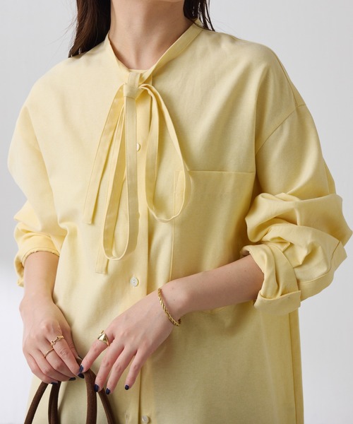 シンプルコーデに上品な差し色をプラス◎ 【POINT】 ・程よくラフな雰囲気で着られるオックス生地のボウタイシャツ。 ・長めの袖丈やゆとりのあるサイジングがボウタイの甘さを軽減させてカジュアルな印象に◎ ・ボウタイは細めにすることで女性らしさを演出◎ ・ニットの中に着てもごわつかず、それでいて寒い時期からも取り入れやすいよう生地の厚さにこだわりました。 【おすすめコーディネート】 丈も長いのでベストやスウェットと合わせて裾やリボンをチラ見せしてレイヤードするのがおすすめです。 【おすすめのスタイリングアイテム】 ・ウールライクベルテッドスカート CLZ1061101A0004 ・3つ釦コンビスリーブジャケット CLZ1052607A0001 ・レザーライクミニスカパン CLZ1052401A0004 【素材】 綿60%、ポリエステル40% 透け感:ややあり 裏地:なし 伸縮性:なし 光沢感:なし おすすめ着用時期:真夏以外 洗濯:手洗い可 【気になる商品は「お気に入り」登録を】 ハートマークをクリックし、お好きなカラーを選んでお気に入りに登録すると 入荷情報や残り1点の通知、完売カラーの再入荷、セール情報などを受け取ることができます。 ※撮影場所やお使いのモニター環境により若干お色味が異なる場合がございます。 特にロケの撮影では明るく見える傾向にございます。詳細撮影画像で色味をお確かめくださいます様お願いいたします。 ※サンプルで撮影をしております。若干の仕様が変更になる場合がございますので予めご了承の上ご注文くださいますようお願いいたします。 ※サンプルでの採寸のためあくまで目安となります。予めご了承ください。 ≪返品・交換について≫ ・着用後、洗濯後の返品・交換は致しかねます。 ・商品到着後、着用前に商品状態のご確認をお願い致します。