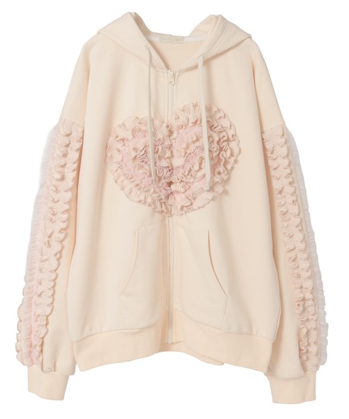 ふにゃりと歪んだハート型のフリルがポイントのフーディーです。チュール生地やテレコ生地を組み合わせて、デコラティブに仕上げました。カジュアルなアイテムですが、ガーリーな着こなしも楽しんでいただけるのがポイント。本体部分にはしっかりとしたスウェット生地を使用しており、ライトなアウターとしてもご着用いただける一着です。・ ・・・・・・・・・ ・・・・・・・・・透け感:なし・伸縮性:あり・生地の厚さ:やや厚手・裏地:なし・ポケット:あり・ ・・・・・・・・・ ・・・・・・・・・ピンク、グレー、ブラック/黒の3色展開【サイズ展開】・FREE(フリーサイズ)#カジュアル#ガーリー#フリル#羽織り#キャンスト#キャンスパ#CND●Candy Stripper/キャンディストリッパー●-BRAND CONCEPT-NO RULE, NO GENRE, NO AGE年齢や性別にとらわれず、自由に自分を表現出来る服【お買い物をもっとお楽しみ頂くために】▼商品のお気に入り登録▼完売カラーの再入荷通知や、ラスト1点通知、プライスダウンしたセール通知も受け取れる♪▼ブランドのお気に入り登録▼新作や再入荷等、いち早くブランドのお得な情報が受け取れる♪