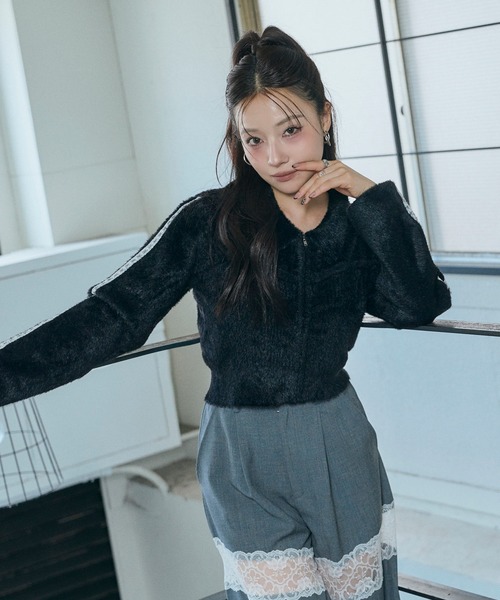 ふんわりシャギーニットに、フロントジップでカジュアルさをプラス。ビスチェを重ねたようなデザインで、肩紐は固定仕様になっているため、着崩れの心配もなし。レースラインを効かせた袖が印象的な仕上がりです。