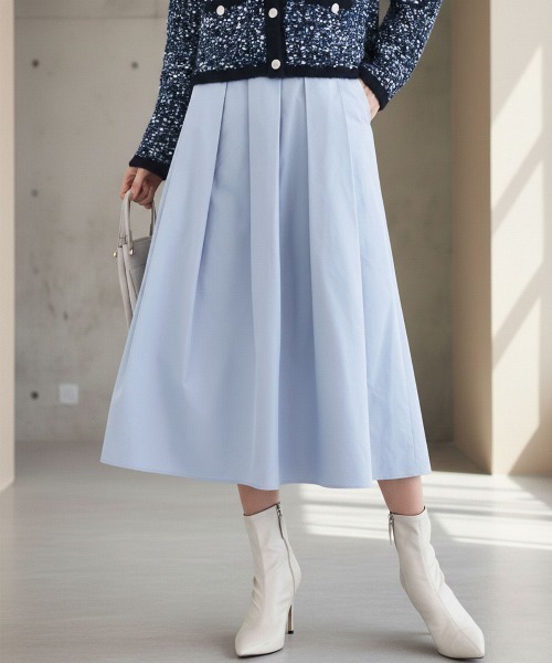 すっきり見えするフレアーシルエットがきれいめ上品に ■デザイン ウエストにタックを施したフレアスカート。広がりすぎないようにすっきりと見えるように仕上げました。軽やかな素材を使用しているので、ストレスなく着用いただけます。 ■素材 しなやかなポリエステル素材を使用した高密度のメモリータフタ素材を使用。適度なハリ感と上品な印象を与える素材です。季節問わず着用できる素材感です。 ■コーディネート 程良いハリがある素材はきれいなシルエットで着こなせます。きれい見えするスカートは幅広いシーンで活躍してくれます。ゆったりニットを合わせてカジュアルに、ジャケットやブラウスを合わせればセミフォーマルなシーンにも◎ -------------------- 着用シーズン 春:◎ 夏:△ 秋:◎ 冬:◎#冬服 -------------------- 洗濯表示: 洗濯機洗い可 透け感:なし 裏地:あり 伸縮性:なし ウエスト:後ろゴム仕様 生地の厚さ:ふつう -------------------- ※自然光・照明の関係、パソコン・スマートフォンなどの環境により、実際と色味が違って見える場合がございます。予めご了承ください。商品の色味は、詳細画像をご参照ください。 ※サンプルでの撮影となるため、実際にお届けする商品と仕様やサイズが異なる場合がございます。
