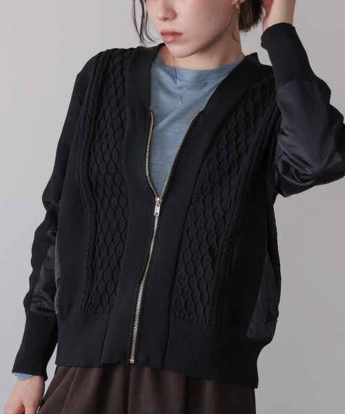■POINT 大人のカジュアルコーデにぴったりのドッキングのブルゾン。ケーブル編みのニットの身頃に、サイドや袖の異素材切り替えが軽やかな抜け感をプラスし、動きのある表情を演出しています。どの角度から見ても印象的に仕上がります。程よくゆとりのあるシルエットで、カジュアルにもきれいめにも合わせやすい万能アイテム。 ■FABRIC おうちで洗濯可。 ………………… 透け感:なし 裏地:なし ………………… ★商品のお気に入り登録 登録すると、完売しても再入荷時に通知を受け取ることができます。 ほかにもお得な特典があるかもしれません♪ ★ブランドのお気に入り登録 新商品や再入荷などの情報を受け取ることができますので、是非ご登録ください♪