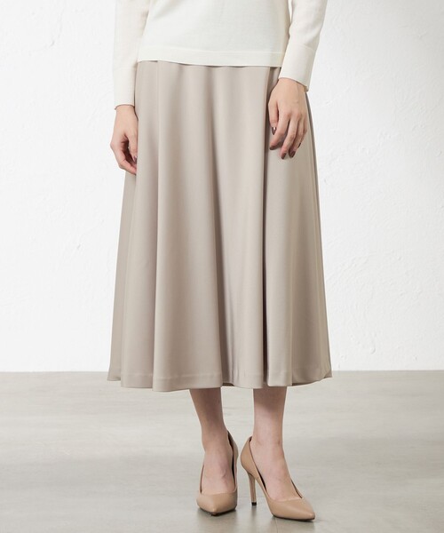 シルエットが美しい、着映えスカート【デザイン】マットなツヤ感のあるサテン素材のフレアスカートは上品で落ち着いた質感が特徴です。程よい厚みがあるため寒い冬にも着て頂けます。1枚持っているとスタイリングの幅が広がる万能アイテムです。レース襟ニット(V5N20-642)とのコーディネートもおすすめです。カラー展開はブラックネイビーとベージュの2色展開です。【素材】シーズン問わずロングトレンド中のサテン素材。表も裏もサテン組織にしてシルクライクなポリエステルをふんだんに使った高級感あふれるダブルサテンにしてあります。ストレッチ性と身体のラインを拾いにくい肉感がスカートにぴったりですの素材です。手洗い可能でお手入れしていただきやすくなっております。