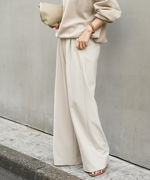 EVERYDAY I LIKE.の定番イージーワイドパンツが待望の再入荷!ニュアンスカラーが美しいベージュが今シーズンも登場。リラクシーで綺麗見えが叶う素材と楽に履けるウエストゴムのイージーな仕様のシルエットが美しい1タック型のワイドパンツ。ゴム仕様のウエストはフロント部分がベルトになっているので、トップスをインにした際も綺麗に見えるのも嬉しいポイント。トップスを選ばず幅広いアイテムに合わせやすく、さらにシーズンレスで穿けるので持っていて損はないおすすめの1本。*********************透け感:なし裏地:なし伸縮性:あり光沢感:ややあり生地の厚さ:普通*********************【スタッフ着用コメント】《STAFF.S》20代後半/身長:162cm/体型:普通/普段サイズ:S/着用サイズ:34サイズ感:ヒールを履いてちょうどいい丈感。ウエストはゴムで楽に穿けます。素材感:とろみ感があり綺麗に流れ、薄すぎずにシーズンレスで着用できます。着心地:全体にゆとりがありリラクシー。ウエストのゴムも中でくるくるしない作りでウエストゴムパンツで気になりがちな点もないのも嬉しい。*********************※同シリーズのお色違いはこちらでご用意しております。商品番号:25030500808030*イージー ワイド パンツ※同一商品:24030500813030(若干の仕様変更がある場合がございます。)※取り扱いについては、商品についている洗濯表示にてご確認下さい。※照明の関係により、実際よりも色味が違って見える場合がありますまたパソコン・スマートフォンなどの環境により、若干製品と画像のカラーが異なる場合もございます。※商品の色味は、商品アップ画像をご参照ください。モデルサイズ:身長:163cm 着用サイズ:36本体:手洗い可能