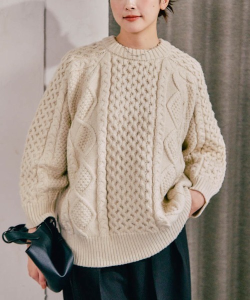 ■point・立体感のあるケーブル編み・ゆるっと抜け感のあるシルエット・ふんわり柔らかな風合い■detail立体的なケーブル編みが目を引くニットトップス。シンプルな中にも存在感のある編地で、着るだけで季節感とぬくもりを感じられる一枚です。肩を落としたドロップショルダーと程よくゆったりとした身幅で、リラックス感のある着心地を実現。やや長めの着丈は気になる腰回りをさりげなくカバーし、タックイン・アウトどちらのスタイルも楽しめるデザインに。デイリーに着回しやすいベーシックカラー展開で、どんなコーデにも自然と馴染む万能ニットです。肌に触れたときもチクチクしにくい柔らかなニット素材を使用しており、長時間の着用でも快適。ふんわりと包み込むような軽い着心地で、秋冬シーズンのデイリーニットとして大活躍間違いなしです。■fabricふっくらとした編地が魅力のケーブルニット素材。柔らかく優しい肌触りで、ウールライクな見た目ながらも軽くて扱いやすいのがポイント。保温性がありながら通気性も兼ね備えているため、室内外の温度差にも快適に対応します。透け感:なし厚さ:中厚手伸縮性:あり裏地:なしポケット:なし洗濯方法:手洗い推奨※詳しいお手入れ方法は商品タグをご参照ください。■coordinateゆるっとしたシルエットを活かして、デニムやワイドパンツなどカジュアルボトムと合わせるだけでこなれた雰囲気に。女性らしく仕上げたい日は、ロングスカートやプリーツスカートと組み合わせてフェミニンにまとめるのもおすすめです。シャツやタートルネックをインしてレイヤードすれば、奥行きのある冬スタイルが完成。アウターはショート丈のコートやブルゾンでバランスよく仕上げると、すっきりとした印象に。オンにもオフにも使える万能ニットとして、ワードローブに一枚あると重宝します。■サイズ総丈:64cm バスト:122cm 裄丈:70cm