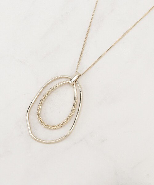 大きめのリングを2つ重ねたワントップネックレス。【デザイン】デザインの違うオーバル型のメタルリングを2つ重ねたリングネックレス。大ぶりサイズなので、ミドルゲージなどの厚みのあるニットにも映えるデザインです。さっとつけるだけで印象的なコーディネイトになります。※照明の関係により、実際よりも色味が違って見える場合があります。また、パソコン・スマートフォンなどの環境により、若干製品と画像のカラーが異なる場合もございます。店舗へのお問い合わせ商品番号:769-84112●製品寸法:00:全長60cm モチーフH5cm モチーフW3.5cm備考: