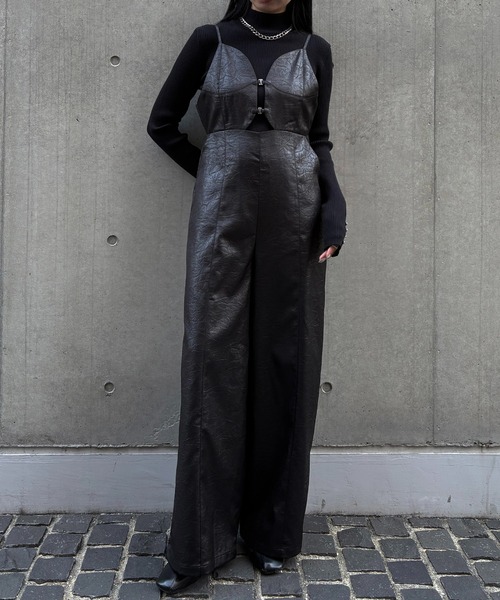 レザーライクな質感で大人モードに仕上げたオールインワン 【Point】 上品な光沢を放つツイル生地にエンボス加工を施し、レザーのような質感に仕上げた一着。 デザイン性のある生地ながらも、シルエットはベーシックにまとめており、幅広いスタイリングに対応します。 ビスチェ部分のホックディテールが、ほどよいモード感をプラス。 細めの肩紐で上品さを演出し、長さの調整も可能です。 背中をオープンにすることで、すっきりとした抜け感のあるバックスタイルに。 ゆとりのある着心地ながらも、高めのウエスト切替でスタイルアップ効果を叶えます。 【Styling】 ・カジュアルにもきれいめにも、幅広いコーディネートで着こなしが可能 ・タートルニットやシャツとレイヤードしたハンサムスタイル ・レースやフリルなど甘さのあるインナーと合わせたフェミニンスタイル ・シアーやベロアなど素材にこだわったインナーでシーズンライクなスタイル ・ジャケットやカーディガンを羽織った着こなしも◎ ---------------------------------------------------- 【Detail】 ・マットな光沢感で落ち着いた雰囲気に ・両サイドにはポケットを施し機能性も抜群 ・肩紐の長さはアジャスターで調節可能 ・シーズンレスで着用できる万能アイテム 透け感/なし 光沢感/ややあり 伸縮性/なし 裏地/あり 生地の厚さ/ふつう ---------------------------------------------------- ※撮影場所により、実際の色味と若干異なる場合がございます。 またパソコン・スマートフォンなどの環境により、若干製品と画像のカラーが異なる場合もございます。予めご了承ください。 ※商品画像はサンプルのため、色味やサイズ等の仕様に変更がある場合がございますので、予めご了承ください。 ---------------------------------------------------- 【お買い物を楽しんで頂く為に】 ■商品のお気に入り登録 お気に入りの登録をして頂きますと 完売カラーの再入荷通知や、ラスト1点の通知を受け取ることができます。 ■ブランドのお気に入り登録 新商品の発売や再入荷、タイムセールやクーポン発行のお知らせなど &g'aimeがお届けするお得な情報を受け取ることができます。
